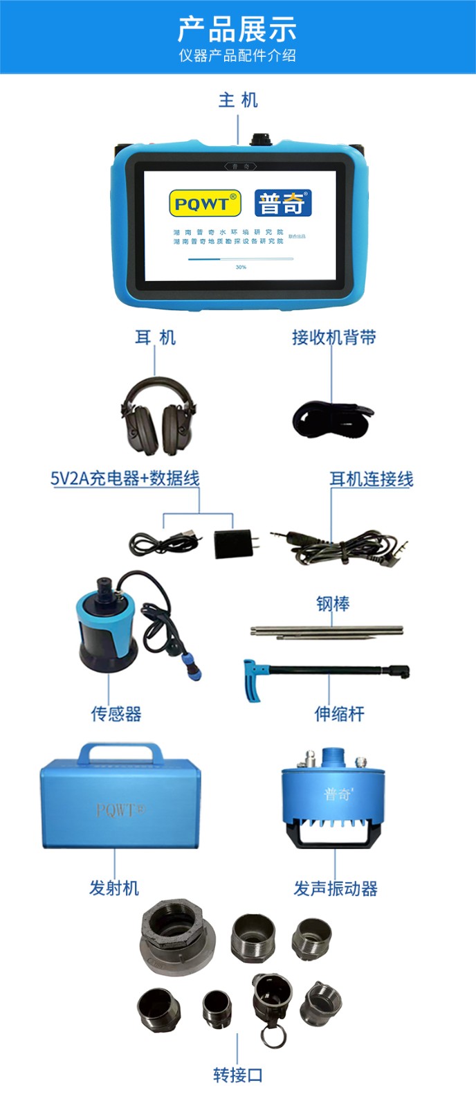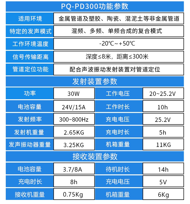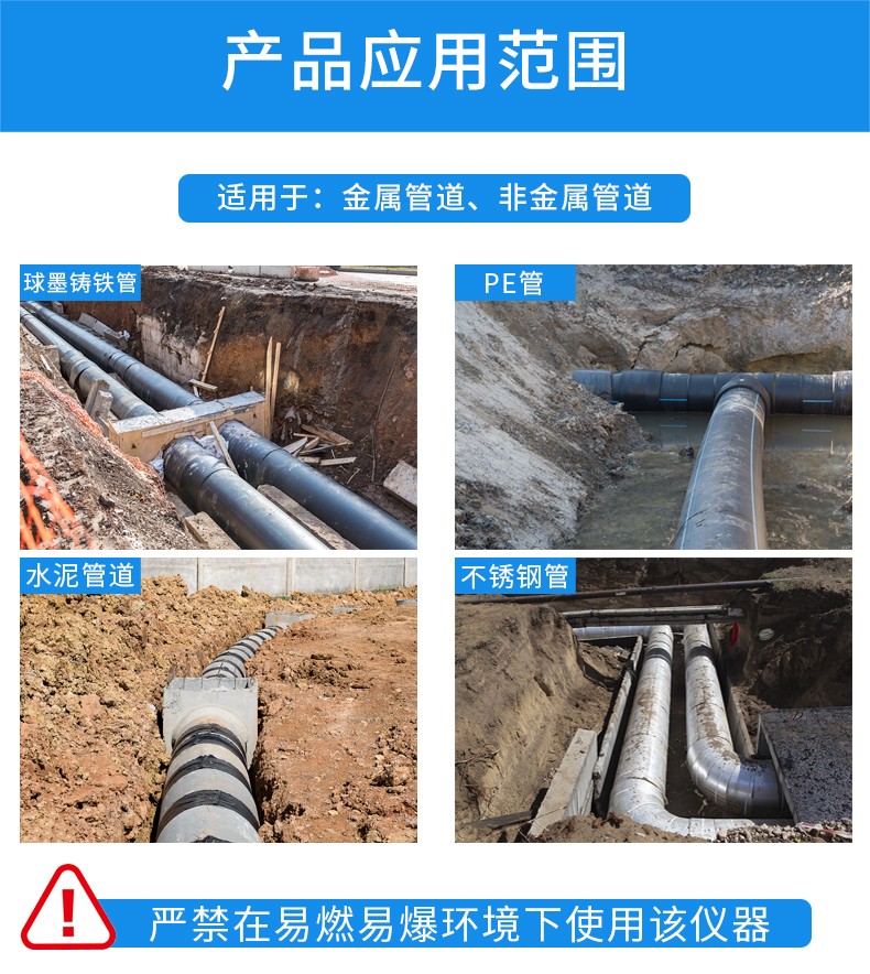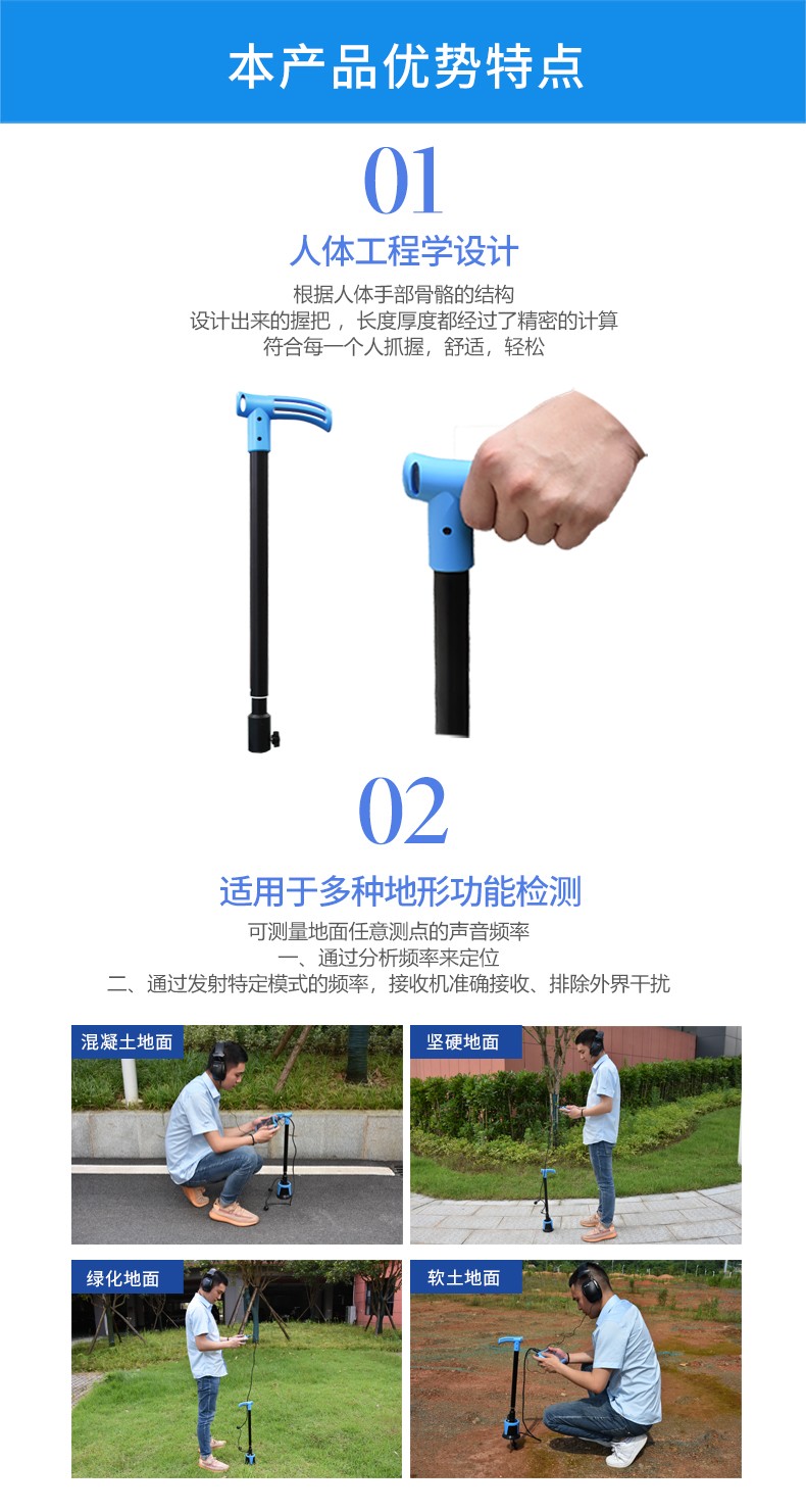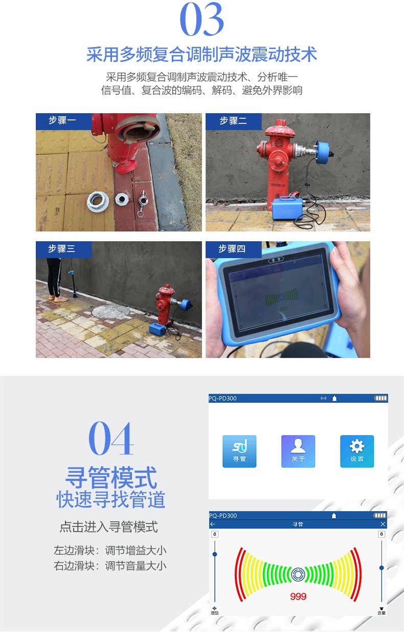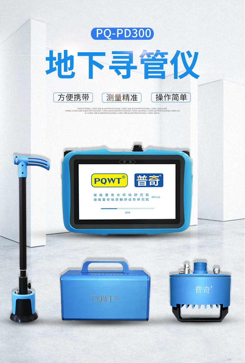 普奇PQWT-PD300地下尋管儀是我院新研發(fā)的 款性能優(yōu)越,攜帶便捷的專業(yè)型針對非金屬及金屬管道位置走向的探測設(shè)備,區(qū)別于目前市場上傳統(tǒng)的僅針對金屬管道定位的儀器,儀器采用多頻復(fù)合調(diào)制聲波震動技術(shù),通過在管道接口處安裝發(fā)聲振動器,在管道內(nèi)產(chǎn)生多種頻率混合的特定聲波信號,該信號JII頁著管道雙向橫向傳輸并垂直傳遞到地面上,通過傳感器進(jìn)行聲音采集,采集后的信號通過接收主機(jī)處理,以可視化頻譜及信號柱的方式顯示在主機(jī)屏幕上,同時(shí)聲音也會通過主機(jī)輸出到耳機(jī),通過 “ 昕” ,“看 ” 兩種方式結(jié)合分析判斷管道的位置和走向.